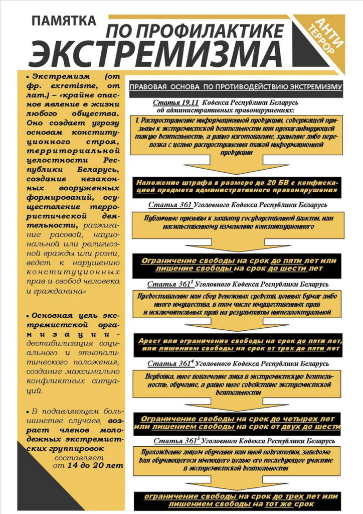 НАМ ВСЕМ ВАЖНО ПОМНИТЬ, что деятельность любых организаций должна строго соответствовать Конституции Республики Беларусь и действующему законодательству, в том числе Закону Республики Беларусь «О противодействии экстремизму» от 4 января 2007 года №203-З.